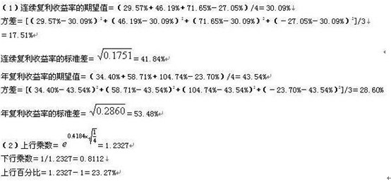 【答案解析】:根据教材253页公式可知,甲股票第2年的连续复利收益率=ln[(13.5+1.5)/10]=40.55%