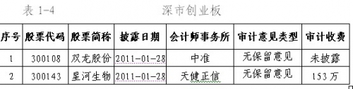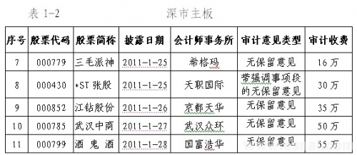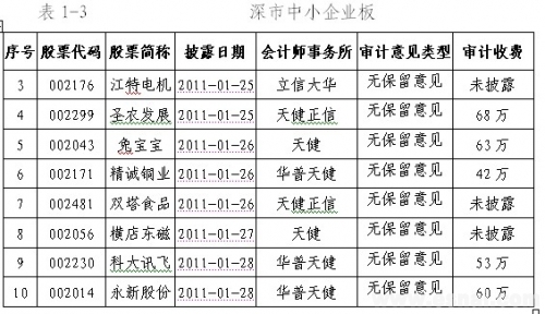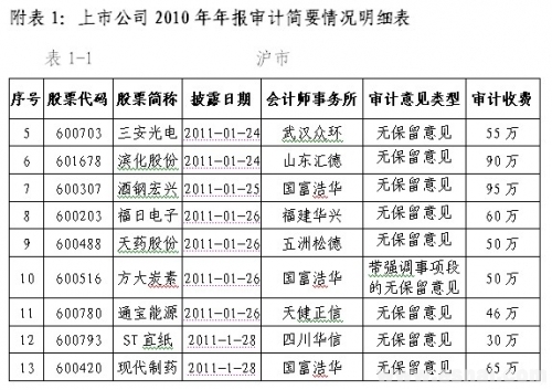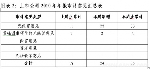 2011年1月28日,中注协发布2010年报审计情况快报(第三期),快报信息显示,1月24日—1月28日,沪深两市共有24家上市公司披露了2010年年度报告(详见附表1),其中,沪市9家,深市主板5家,深市中小企业板8家,深市创业板2家。从审计意见类型看,22家上市公司被出具了无保留意见的审计报告,2家上市公司(*ST张股、方大炭素)被出具了带强调事项段的无保留意见审计报告。