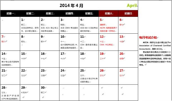 2014年4月 财会类考试日程安排